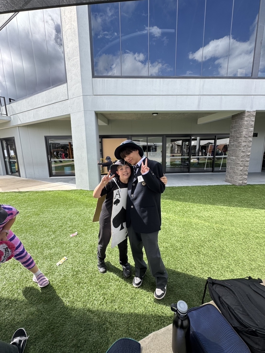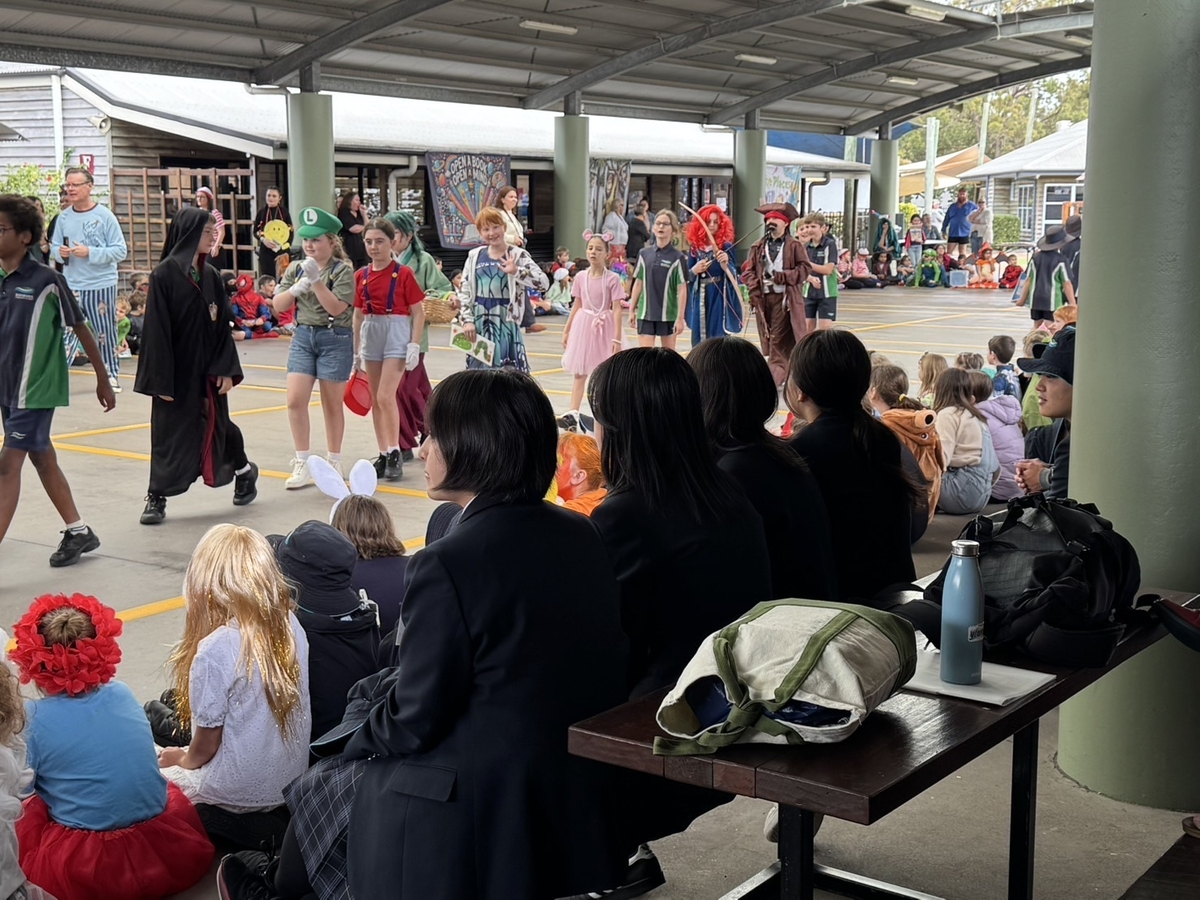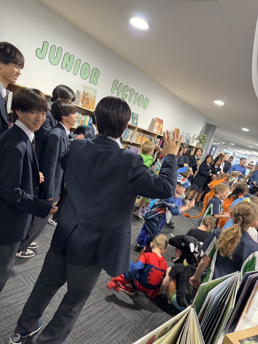 この日はブックウィークのパレードが行われ、リバーサイド・クリスチャン・カレッジの生徒たちが思い思いの仮装をして参加していました。友達が手を振ってくれる姿に、本校の生徒たちも感激していました。